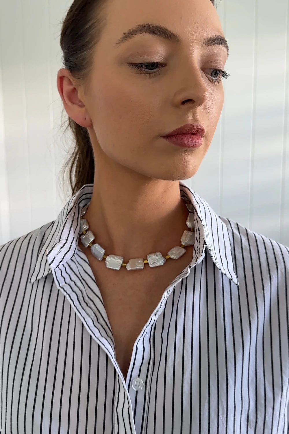 A celebration of modernist luxury, this piece features sixteen baroque freshwater pearls dotted with brass feature beads. Wear casually under a shirt or take them on a night out.